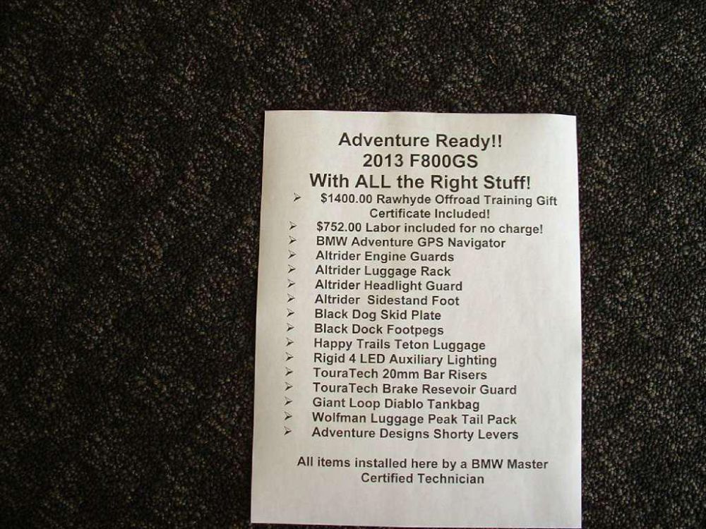 2013 Bmw F 800 GS, Looking for a loaded F800GS ready to do it all? You just found one and weve done all the work! - We uncrated this 2013 F800GS and set upon equipping it with what youd need to attack Baja, the Continental Divide or you name it. We worked closely with Jim Hyde at the Rawhyde Training Center to acquire and install all the right stuff. He was so pleased with our finished product that he authorized its buyer a free Off Road Session at his training center in Castaic California. This training would normally run $1400 and represents a real value to the serious adventurer. We tallied up our shop labor charge to install it the extras and that totaled $752 and is free on this unit as well. The list is long as to the accessories aboard this bike but here goes: Altrider supplied the engine guards, luggage rack, headlight guard, and sidestand foot. The heavy duty skid plate and large cleated pegs came from Black Dog while BMW supplied The Adventure Navigator. The hard cases came from Happy Trails and the auxiliary lights are none other than Rigid. Tour- a-tech came up with the 20 mm Bar Risers and the brake resevoir guard. The tank bag is a Giant Loop Diablo. The tail pack is from Wolfman and finally, Adventure designs made the shorty levers ideal for off road use. You can bet we are proud of the finished bike. Our dealer added accessories total $3,970. The DSRP on the bike with all the accessories is $17,060. Also be aware any additional manufacturer or dealer incentives and will apply to this unit. We have but one of these to sell so dont wait too long or you may miss out on this very ready F800GS. Challenges? Yes! Compromises? No! This is the motto of the revised F 800 GS - the sportiest member of the big GS family. The motorcycle continues its longstanding success story, providing impressive versatility both on and off the road: the ultimate versatile enduro machine with sporty genes. The front section of the body in particular has undergone significant transformation: the new fuel tank trim, intake snorkel, upper mudguard and a new windshield give the bike that extra dash of dynamic performance, reflecting the off-road side of the F 800 GS. Lowering is now available as an option for the F 800 GS, too. So in conjunction with the low seat, this means it is possible to create a seat height of 32.3 inches. Meanwhile, Switchable ABS is installed and ensures an additional dimension of safety. The F 800 GS comes in three exciting color variants: Kalamata metallic, Alpine White 3 and Cordoba Blue. From tough and modern to athletic and dynamic - this bike is guaranteed to offer something for everyone. F 800 GS: the on and off-roads have never been so close and this one is oh so ready to stand and deliver.