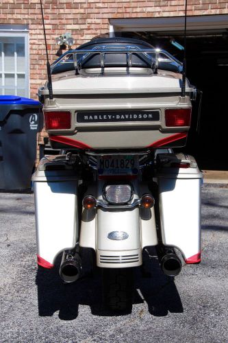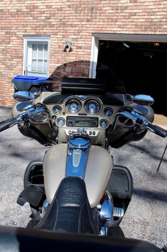 I bought this bike about 5 years ago with 3,200 miles on it. She had been laid down. I replaced the front fender, handle bars, and bags...then started customizing her! Just some of the stuff I added painted faring with adj vent painted to match tour package with latches and LED light chrome louver, brake cover, 525 chub bars with wiring in bars, 6 speed transmission, chrome-side cover, center stand/ painted to match lower bags, with spoiler light, custom latches, power commander with dyno 100hp. Chrome on engine- throughout, Glock windshield, custom mirror and lower rear taillight. Reinhart ext. w/2" fender pipes,