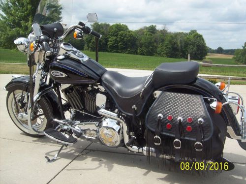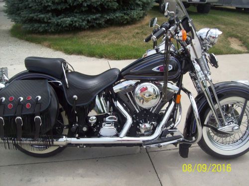 I have a 1998 Harley Davidson Heritage Springer. The bike has stock exhaust with turn out slip on mufflers, big sucker air cleaner, neons that can change color and flash fast /slow or stay solid, removable windshield. I also just added the new style bright hi def head light and LED tail light. It has 18xxx miles. Use synthetic oil. It is extremely clean and runs excellent. Only selling because I just purchased an ultra classic. Price is firm. I do not need to sell. Please DO NOT CALL TO HELP SELL. video at this link https://youtu.be/kJ3KS0sSWIo or text for video at 419571396six I also have a video of it running if interested.