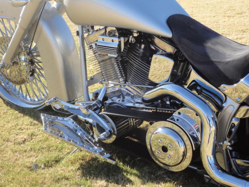 Lowered price has to go this week my loss is your gain !!Up for sale my custom heritage the only thing that's 1999 on this bike is the frame which has been powder coated silver to match the paint. This is a complete custom build from the ground up. NO BUDGET SPARED ON THIS BUILD !! This is a new build every part on this bike is less then then 9 months old including new wiring and new tires the bike itself has les then a 1000 miles on it including new metallic silver fresh paint not a nick or scratch on this bike. The motor has 7k miles on it was removed from a chopper and rebuilt flawless and tons of torque124S&S polished motor 630 woods camshaft Dual Patrick Racing Carburators 6 speed jims transmission. Brute 4inch open primary. Silent cycles floorboards, accutronix foot controls. Jaybrake 6piston calipers with jaybrake hand controls with micro switch buttons. Internal throttle hydraulic clutch all internal cabling. Custom stretched gas tank,custom stretched front and rear fenders. Legends air ride, chrome swing arm , custom seat, Custom raked frame cut in neck to fit the massive Ride wright 23inch fat daddy smoothie front wheel, Ride Wright rear wheel. Sampson 39in fishtail exhaust. Joker mini LED bullet tail tights stretched oil tank all steel braided lines. Carlini 16 inch gangsta ape hangers. The pictures shown is with air ride all the way down for better stance will air up for ride height setting. I have receipts of this build over 25K in it all records of every part. Serious buyers only no joy rides Greg -602-576-9000
