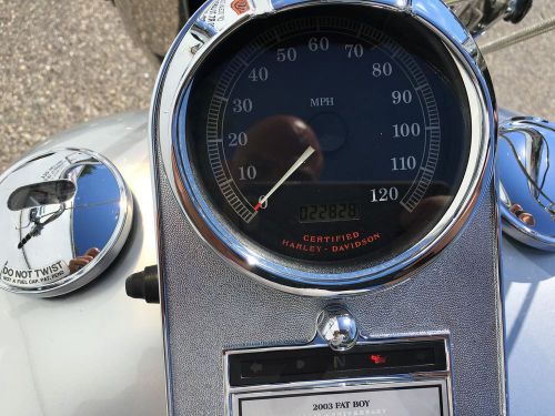 2003 HARLEY DAVIDSON 100TH ANNIVERSARY EDITION FATBOY WITH THOUSANDS IN TASTEFUL UPGRADES ,14" APES ,EXHAUST ,MATCHING EMBLEM ANNIVERSARY SADDLEBAGS AND SEAT ,TRIPLE LIGHT BAR ,ENGINE GUARDS AND SO MUCH MORE ,THE BIKE HAS JUST RECEIVED A FULL SERVICE HERE AT OUR AUTHORIZED FACILITY AND THE WIDE WHITEWALLS HAVE 0 MILES ON THEM THIS BIKE IS IN WAY ABOVE AVERAGE CONDITION ,THIS IS A COLLECTIBLE TO BE RIDDEN !!! A VERY IMPRESSIVE CARBURETED BIKE THAT RUNS LIKE ITS NEW ,WANT TO OWN A PIECE OF HARLEY HISTORY THAT YOU CAN RIDE WITH EVERY DAY RELIABILITY ? THIS IS IT !!!