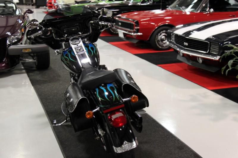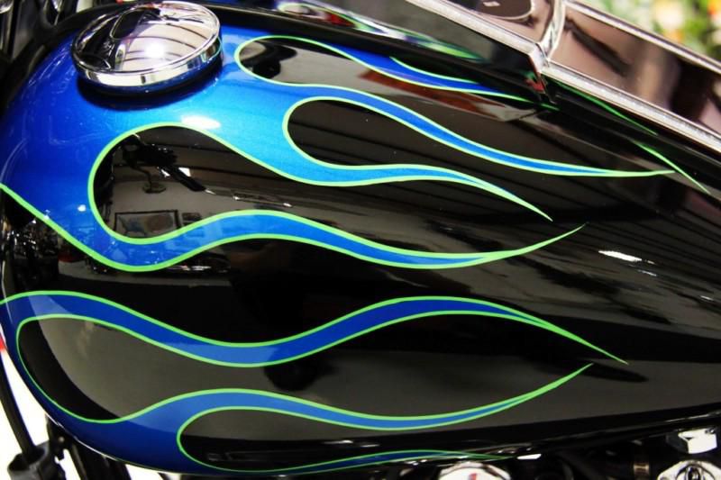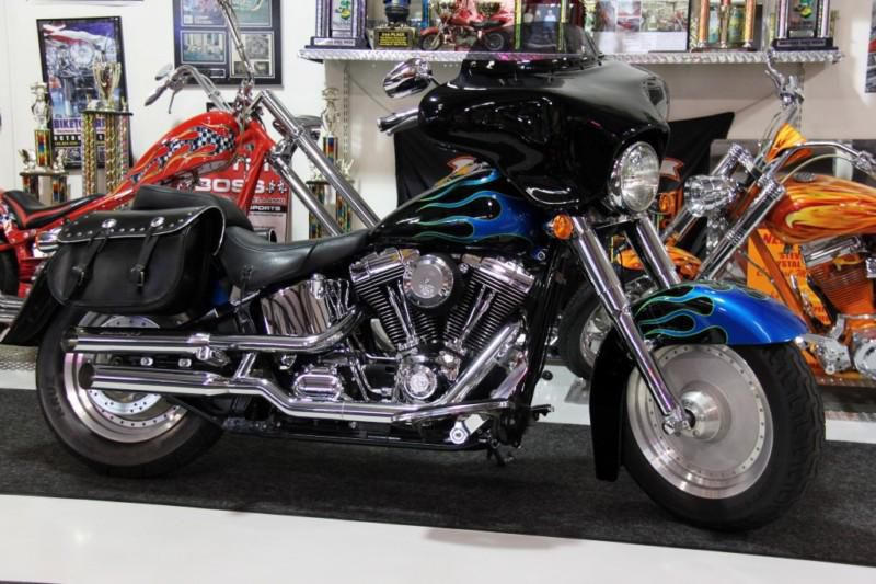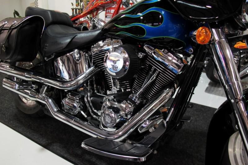 This is a very cool & custom 2004 Fatboy! The previous owner took very good care of this bike and it shows very well. Custom upgrades include: blue flame paint, front fairing, low profile windshield, chrome forks, screaming eagle II mufflers, chrome hand grips, removable saddle bags and more.