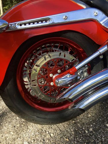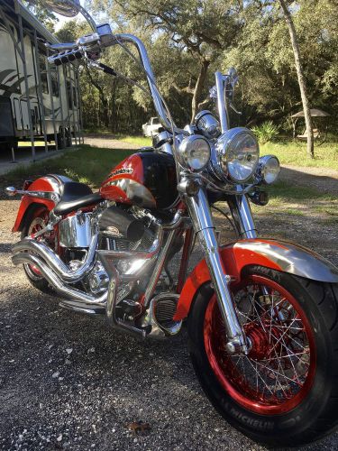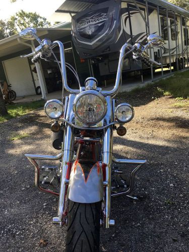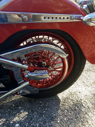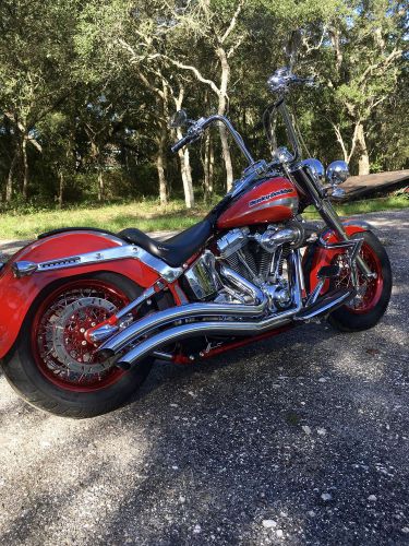 This is one very sweet good looking strong running FatBoy. Hill Country Choppers 16inch bars, LaPera seat, Cobra big radius exhaust Progressive 422 adjustable shocks, Fat Daddy tubeless wheels with matching pulley and rotors, Rims are powder coated candy apple red, screaming eagle 103 CI engine, new Michelin Commander 2 tires.EFI, SE intake, Trophy winner, Bike has transferable extended warranty