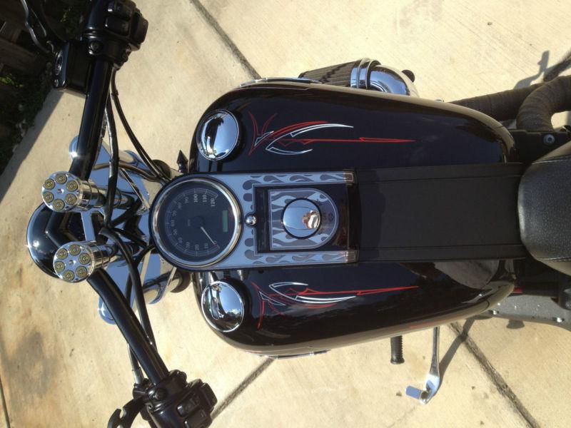 The bike is a one owner motorcycle. The bike has been garage kept and undercover since it was new. The bike has custom pinstriping and lots of powdercoating. It has a 21" front wheel with aluminum hub and powdercoated black with stainless 80 spoke. The rear wheel is 18" and powdercoated black with stainless 80 spoke. The exhaust is martin brothers wrapped with heat wrap under the heat wrap the pipes have been ceramic coated black. It also has a wimmer air cleaner. The handlebars are whiskey bars from choppers inc. along with the risers and grips are also from choppers inc.. It has been lowered 2" but can be adjusted. The bike has 5 degree triple trees and black lower legs. Harley black floating rotors and lots more parts to many to list all