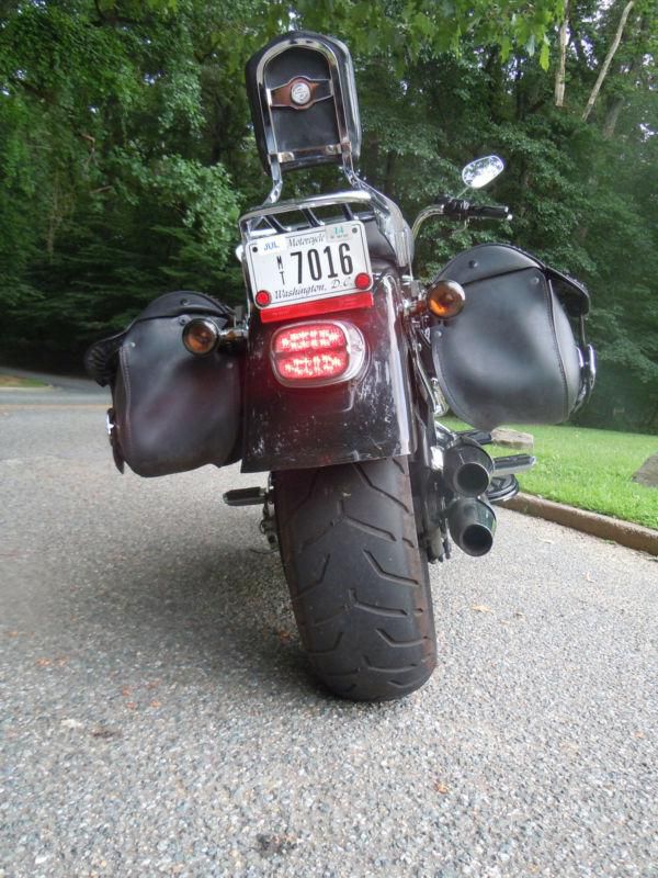 This is my daily ride and I live in the city, so it shows some wear. There is a scratch in the tank and the main drive cover, and there is some fading of the leather and gauges. It's in great mechanical condition and runs strong, but it will need some maintenance before taking any long trips. It has a padded sissy bar, saddle bags, and custom grips and floor boards, as well as the chrome front fork kit and lights. I am the original owner, and it was purchased new at Patriot Harley Davidson in Fairfax, VA. I have had most of the maintenance performed there, or by a local mechanic who was trained by Harley Davidson.