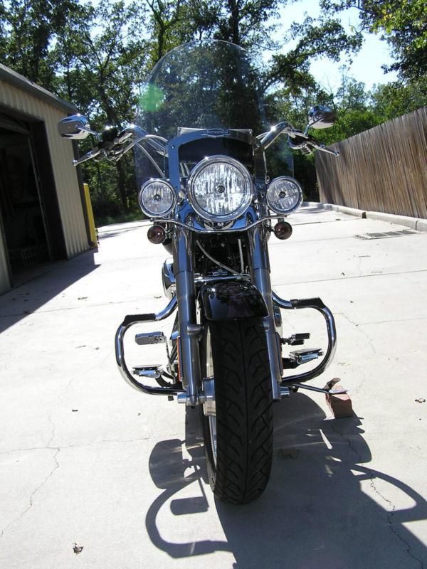 Adds: Hi-Flow Intake, Vance & Hines Full coverage Long Shot Duals, 1 3/4" Rear lowering Kit, Chrome passing signal bar with smoked lenses and amber bulbs, Drag Specialties solo seat- Faux Ostrich, 1 1/4 Bagger II Handlebars, Chrome Master Cylinder, 1 1/4 Billet risers w/ Top Clamp, Braided Cables, Chrome trigger levers, Kuryakyn Iso Grips w/ Throttle Boss, Chrome Switch Housing, Full Hot Topper Kit, H-D Windshield Bag, Chrome lower Belt Guard, Chrome Sprocket Cover, Black rear fender bib, New tires and battery.