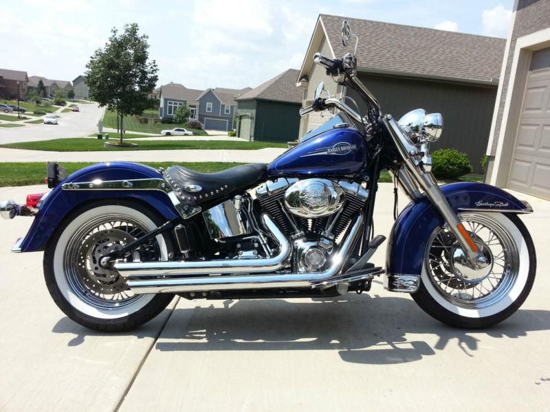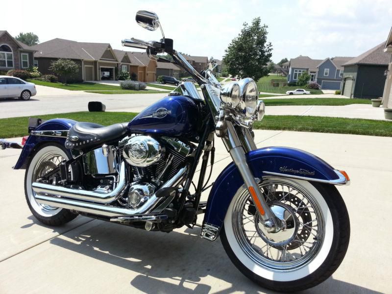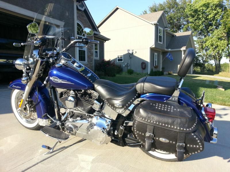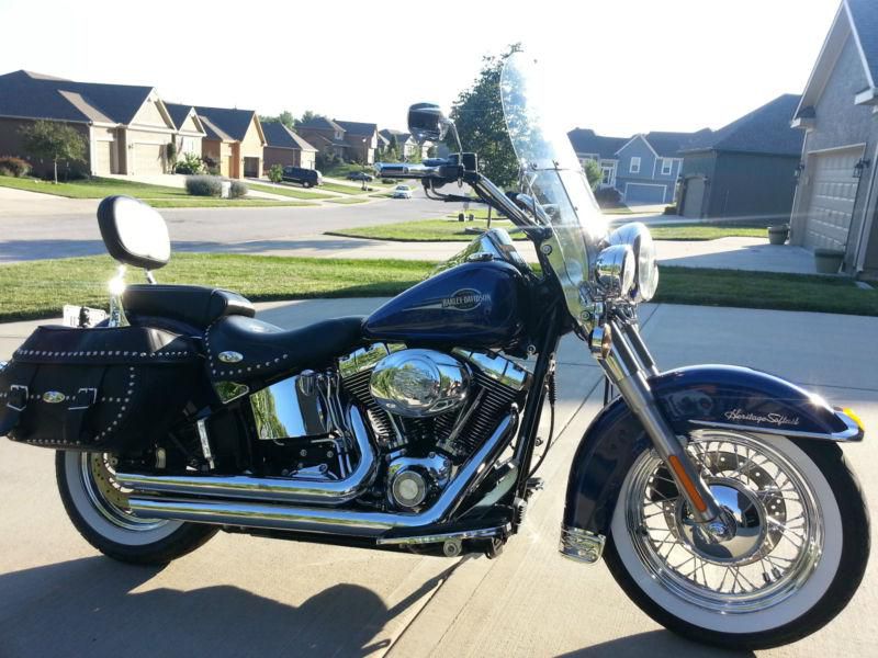 2007 Heritage Softail. Very CLEAN!!!!!!!!!! Cobalt Blue. I am the second owner. I purchased the bike from Worth HD when it was 1 yr old with 1500 miles, it now has 15901 miles. The bike has always been stored inside and has never been in an accident or laid down. All service has been done as needed and in a timely manner. Bike looks great stripped down for just cruising around town for fully loaded for going on a road trip. Sissy bar and windshield are quick detach. Saddle bags, sissy bar and windshield are nearly new due to the fact that 90% of the time I have the bike stripped down with these things in storage. Exhaust is not custom. Engine is 96cu inch and transmission is a 6 speed. I must have caught a rock some time riding because the only flaw to the paint is a very small pit in the paint on the from fender, it is approx. the size of the ball point on an ink pen.