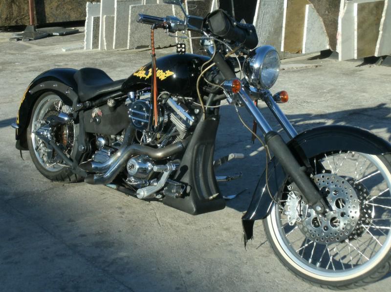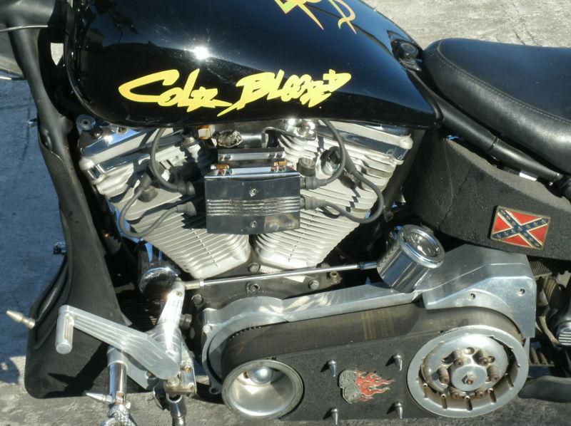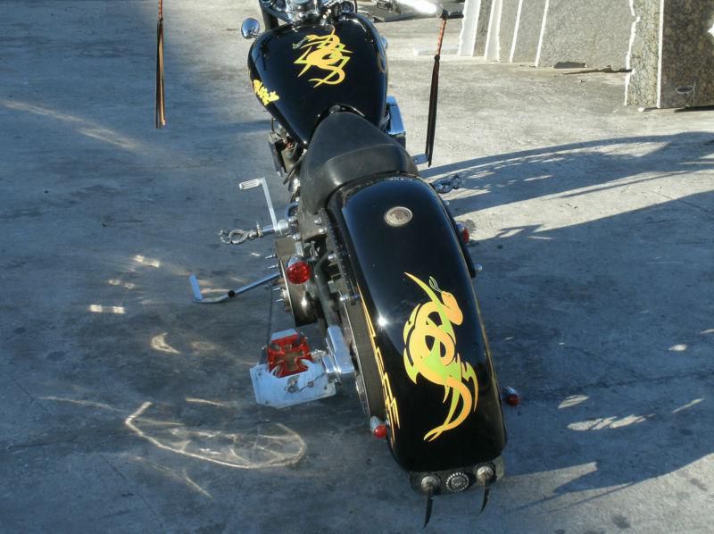 WHEELS WITH STAINLESS TWISTED SPOKES. CRACKED ICE (BLACK) POWDERCOATED FRAME. MODIFIED 'EVO' ENGINE WITH BRANCH DUAL PLUG HEADS, CRANE