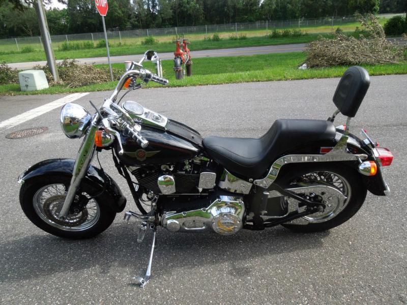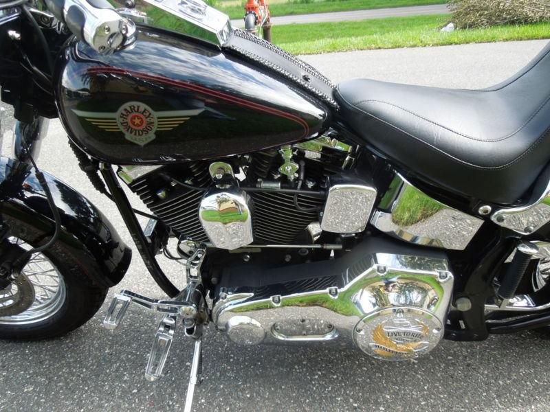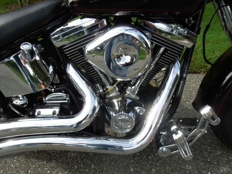 Here is a very clean Evo Black Fatboy!! Nice new wheels, super clean, runs excellent, Nice exhaust, Backrest, Foward Controls, Chrome Front end and lots more!!