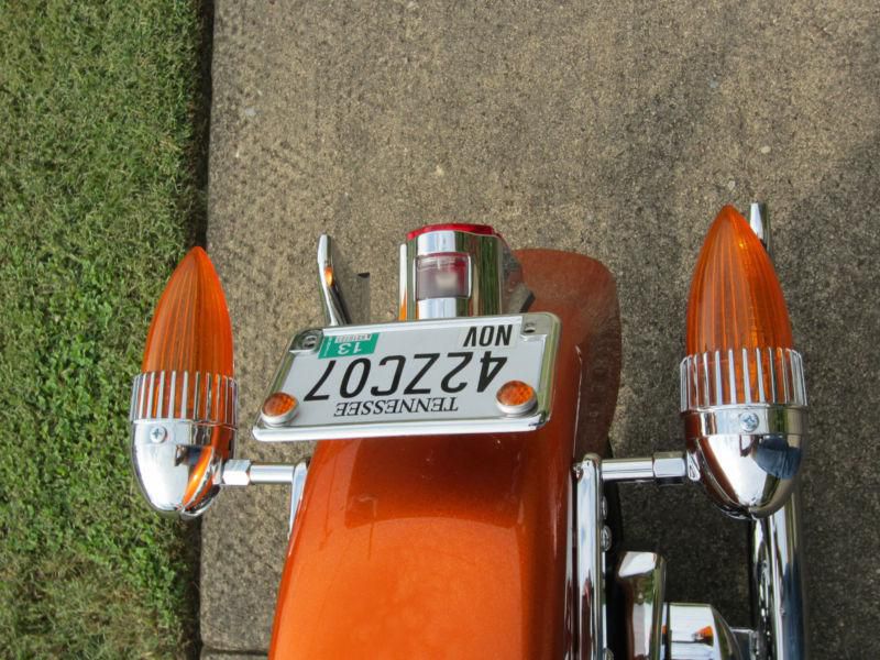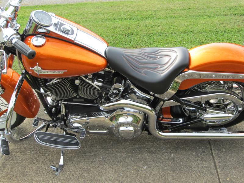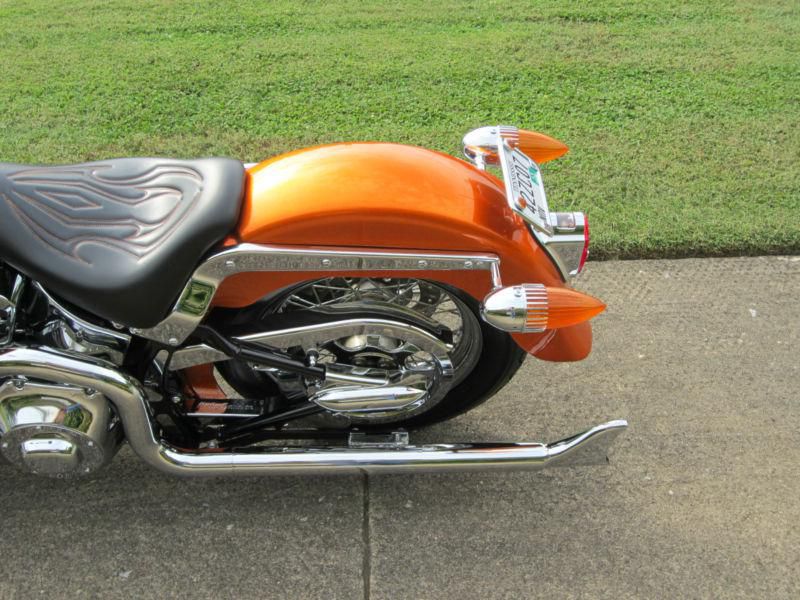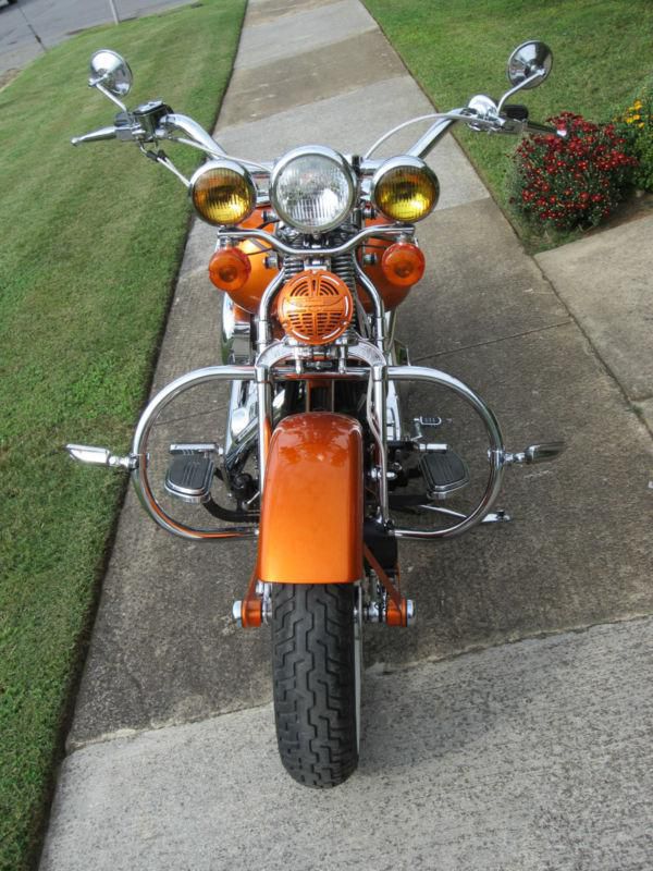 Custom built Heritage Springer. Just cosmetic damage when I got it. It has a rebuilt title, and was inspected by the state of Tennessee, Anti-Theft Inspection PASSED. Lots of time and money went into this one. Has a lot of extras. Like Magmun Chromite cables and break lines.HD oil cooler, Wild 1 Springer Dresser Bars w/wires inside to clean it up. Good N Tight riser bushings. TS relocation brackets by Bubba's. Amber passing lights 1959 Caddy tail lights. Custom Leather seat by C&C with tribal orange stiching. Lowered 1 1/2 inches in the rear with L.A. Choppers overload springs. All the rivets were shaved off to give a smooth look as well as the front fender light. All bolts are chrome. Samson True Duals Fishtails.The paint is slick its Tangerine Dye over a base of silver over a mid coat of flake, right out of the early 70's look, it dont show up well in the picts! Starting auction off at less than half of what I got in it. I reserve the right to end auction early, its for sale localy. Shipping is up to winning bidder, can help out on this end. $500.00 deposit through Pay-Pal, the rest in cash or cashiers check, title will not be released till monies clear the bank. No Reserve, low starting price. Any ? e-mail through E-Bay or call me @ 239-707-3102 i have more picts if you want to see or need to see something else on the bike.