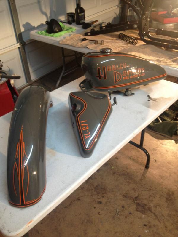 Up for sale is my 1999 Harley Davidson Sportster. It has been completely redone from the frame up!! Frame, Wheels, Light, Bars, Grips, Fork Legs, Triple Trees, all disassembled and powdercoated in satin black. The rear section including seat, Rear fender and struts, and wheel were all done to accomadate the large 23" 40 spoke wheel that is identical to the front. Avon 130s wrap the wheels in the front and rear. All bodywork was then stripped painted and hand striped to give it a vintage tracker feel. Built this thing to show what I can do to a stock sportster platform. Finished it and it needs to be seen rolling thru the streets! This bike has the good looks of a custom and the reliability of a stock Sportster. Only mods to engine are a custom made exhaust and altered air cleaner. This thing is a rider! Bike is tastefully done and will turn heads wherever it goes!! Good Luck and Happy bidding. Buyer is responsible for all shipping but I am easy to work with and am willing to help if i can. Feel free to message me with questions.