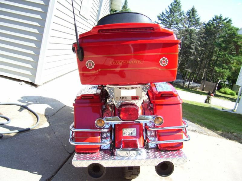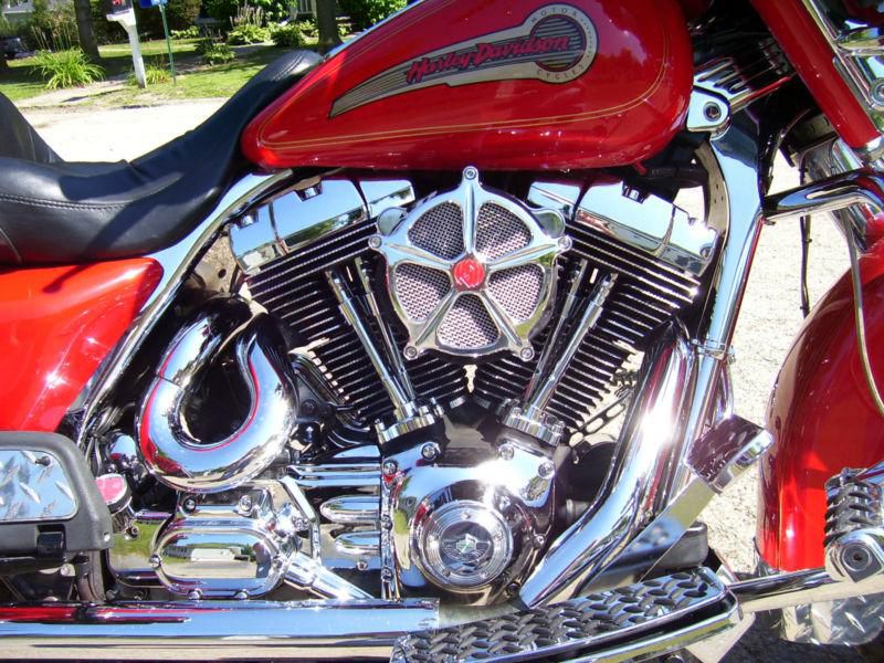 I am selling my 03 FFSE. I am the original owner and bike has clear title. Bike has been stored winters at local Harley dealership. Majority of the service has been done there and paperwork is available along with proof of purchases. I have been constantly adding bling to this bike since the day I got it. I hate to see it go, but I want to sell it to update some stuff on my home. This bike has some mileage on her, but I would trust it to go anywhere. Runs great! My last big trip was last August out to Pennsylvania and I put on 1500 miles. I will list as much as I can recall and let the pictures speak. Lets do the engine first, It has a 95 kit with dome pistons, Manual compression releases, 211 cams, RSD aircleaner, Bassani power curve exhaust that is a true dual system with Jackpot mufflers which are locally made. Power commander has been installed to accomodate the changes. Bike was dyno tuned after the changes and I have the paperwork. I have had the hydraulic cam chain tensioner update with new chain shoes. It has the auto tensioner in the primary. It had a new heavier clutch installed with the engine upgrade. I have added an oil cooler with aux cooling fan system. I took out the air temp guage and installed an oil temp guage in its place. The sending unit for this guage is in the pan to get a more accurate temp of the oil rather than behind the side cover where the sender can be over heated. While the engine work was being done, I had the heads and jugs sent out and were "diamond cut". OK, on to the chassis. I have many chrome covers and there are chrome "hot toppers" in many places. Tires are new. Front forks are chrome with a flush mount axle set up that can be seen in pics. Rotors were updated to floating type with chrome spacers. Calipers are chrome with braided lines and chrome bolt covers. Wheels are OEM but were custom painted to match bike and the trim is hand polished. Headlights are updated and chrome brackets were installed to get rid of the crossbar. Turn signals were updated with the bullet style and the rear bracket was replaced with narrower one. Inner fairing was custom painted to match bike. Klockwerks windshield, chrome guage bezels, chrome switches. I added cruise control. Radiois OEM and has single CD player and has under fairing antennae. I left rear mount on and was going to put a flag mount there, but just didnt get to it. Speakers are J&M. Fairing mounted mirrors have the late model blind spot. I also added the adjustable late model air deflectors. The only 100th anniversary items I added were the gas tank fill cover which is etched, and the timing cover. The only factory badging that came on these biek for the 100th was on the front fender and on the left side of the engine case. The seat buttons were replaced with dress uniform FD buttons. The dash is custom made diamond plate. Other customs made diamond plate includes the rear foot rest fillers, the plate on top and sides of the bags, the license plate mount, the inner bag fillers and of coarse the tailboard and trim. This was all HAND MADE! Cannot be purchased. Bike had lighted spoilers on both tourpack and bags. I also have installed a remote fill site for the rear air suspension on the license plate mount so you dont have to remove the bags to adjust air pressure. Tourpack has the updated "smooth" chrome hinges. Bike had battery tender set up with tender. It has a very discreet receiver hitch under the tailboard with hard wired light harness for trailer. The trailer is a mid 90's Caravan that is no longer produced. I am the second owner of that. It was black and was a factory "second" as it had cosmetic issues. I repainted it to match the bike and added matching pinstriping. Comes with spare tire. Extras that are going with this bike is a cover, service manual, hydraulic motorcycle jack. I also have kept all of the parts that I have replaced on the bike. So there is a couple of boxes of "stuff" cables, brake lines, pistons, exhaust, windshield, etc, etc. basically all of the OEM parts that were replaced. I just noticed that in the pic of the front of the bike, the decal looks faded out, it is not, that is a glare issue with the camera. It is HD's FFSE emblem and is intact. I also noticed that the pics look orange. That is not the case the color is red and the bike and trailer do match. Other info, pic of odometer is showing 57105, I went for a ride this week and its now at 57325. I dropped my camera trying to get a non blurred pic and wrecked the camera so I decided to update this way. On to the other details. I require a $500 deposit upon winning auction. The rest can be arraged by cash, certified bank check, or because this is a large purchase, I am williing to work with your bank and have the money wired from your bank to my bank. Winner will be given my phone number and we will work out pickup/delivery arrangements. Please email me with any questions BEFORE you bid/offer! SERIOUS BIDDERS ONLY!!! If you dont want to purchase, then dont make an offer. Last guy made an offer and then bailed. Thanks for looking!