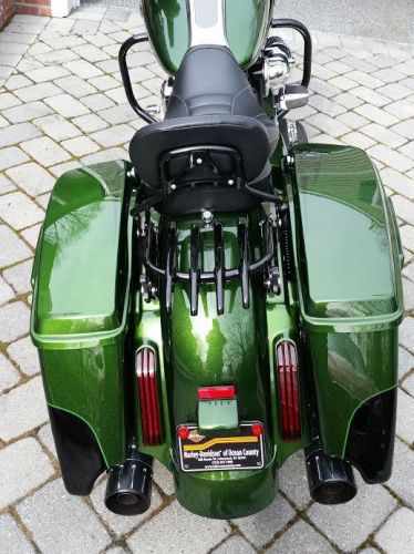 Options: LED rear view mirrors... Two rows of orange LED's, always on ... and alternate with blinkers for added visibility Sissy Bar... Detachable CVO Black Leather and White stitched matching CVO Backrest...Detachable Black Chrome Stealth Luggage rack... Detachable Custom Saddle Bag organizers... Detachable Project Rushmore Bike with auto braking system applied regardless of brake applied on top of ABS brakes. Many other CVO and Project Rushmore Features |