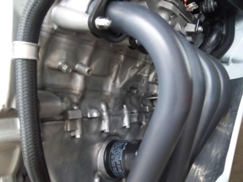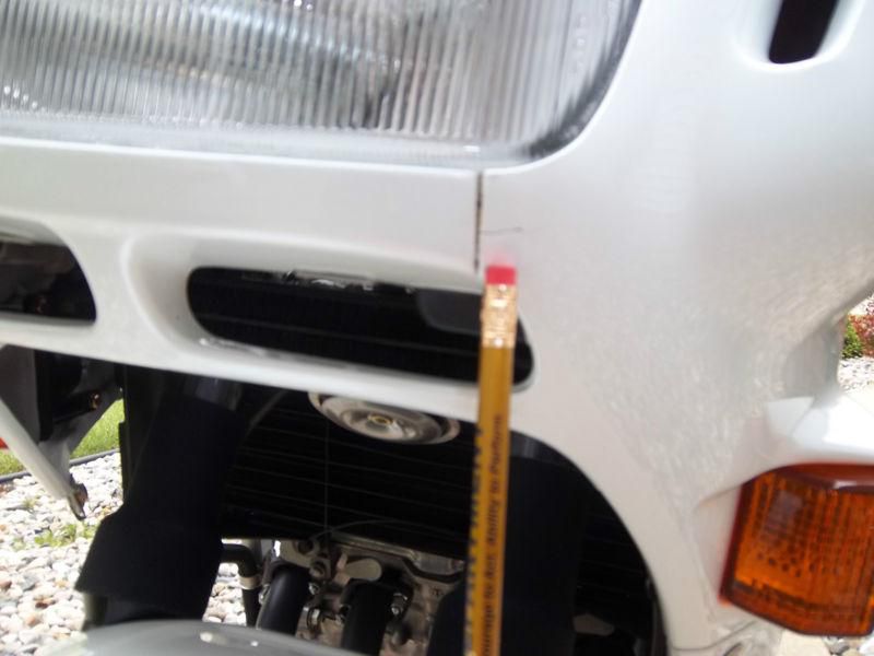 The stock air filter has been replaced with a K & N product. Passenger footrests were removed shortly after the purchase of the bike to streamline the look in the rear. The original brackets that supported the foot rests were taken to a body shop and a friend of mine at the time did the work himself by cutting them off and smoothed all the roughness away and repainted both with a high gloss black finish. The end result is a look that turned out factory perfect. The front fairing has a small crack directly to the lower right of the headlight as you face the front of the bike. (See photo of headlight area) This crack is a factory defect and it was on the bike when it sat on the showroom floor. The seat is in perfect condition without a single flaw.