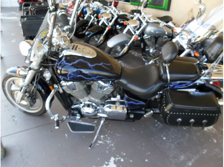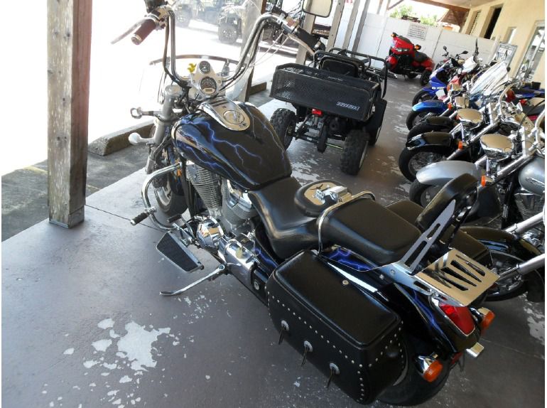 Fresh Trade in.Honda Quality BIG V-TWIN CRUISER.Loaded with extra's,Winsheild,apes,saddle bags,driver and passenger backrest,aftemarket exhaust,tac.Custom paint job Black with Lightning bolts.Web price does not include Sales Tax,Dealer admin fees,and RegistrationSee Scott for complete details.
