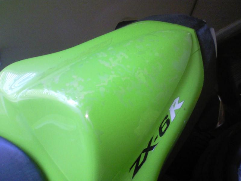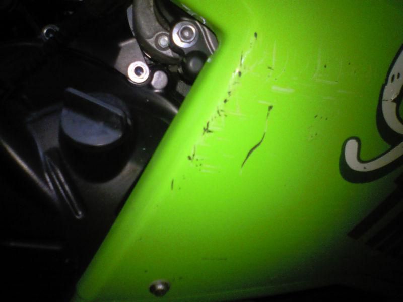 Bike is seldom ridden. I take it around the block and through town about twice a month to keep it fresh. Other than that it sits in the garage. Great mechanical condition. It was knocked over in a parking lot at my friends apartment about 3 years ago. There are some minor scuffs on the right side from that. I took it to a local shop and he said for $500 he would replace the grip, peg and cover and buff the plastic. It wasn't bad enough to me so it is still that way. You can buy new plastics for that much. There are some bubbles in the clear coat on the rear seat cowl. There is a small chip on the left side of the tank from a lawnmower rock. Not a dent just a small chip. The bike is as good mechanically as a new one. I haven't ridden it much since Aug 2011 when I found out my wife was pregnant. Just decided to clean out the garage and let it go. Make me an intelligent offer and its yours. You will not be disappointed. It is the All Green color scheme which is rare. The bike sells itself. Lettering is vinyl and will be removed before sale. Thanks for looking.