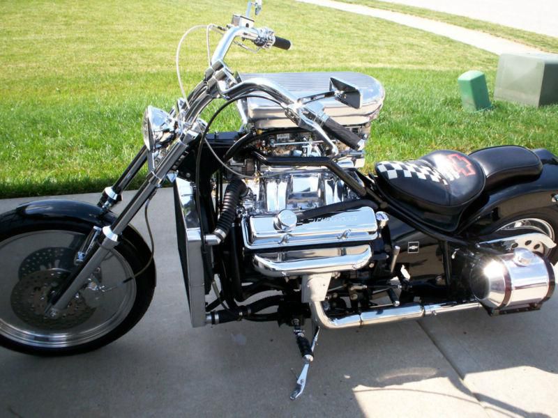 Pro-Street V8 motorcycle with polished hi-rise tunnel ram and (2) 600 Holley carbs. Original manufacturer was a "American King V" in Baton Rouge, LA. 350 Chevy motor with approx. 3,800 miles. Single-speed tranny (no shifting). No reverse. Motor has a "gear drive" (timing chain replaced with gears) which produces a whine that sounds like there's a blower on the motor. HPV-1 direct-fire distributor-less electronic ignition. Lots of new parts including front and back tires. Frame was widened at the top to allow installation of tunnel ram and carbs (all work done last winter by me). Rear of frame is similar to a Harley Softail and front end is early 2000 Harley Wide Glide. Single bike trailer (see pic) comes with motorcycle. Also a small sport style clear windshield goes with the bike (not on the bike in the pictures). Selling "as is" with no warranty whatsoever. Reserve the right to cancel this Ebay ad due to bike being advertised locally. This motorcycle is not for beginners. Although it is similar to a Boss Hoss V8 and other V8 motorcycles, it is much easier to move around when the motor is off. It is extremely powerful (350 to 400+hp). One difference compared to a Boss Hoss or other V8 bike is this V8 motorcycle does not have a clutch "assist" vacuum canister to make the clutch-pull lighter, however it's not too bad. It's similar to an old 1970 Harley iron-head sportster. Not a clutch pull you'd want in stop and go traffic, but ok for highway riding and short rides. I do have a new "Easy-Pull" adapter (for the clutch lever) that will go with the bike that you can install if you want to lessen the clutch pull. I won't install it ...... Sorry, no single person test rides. Might take you a ride around the block if needed.