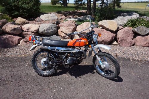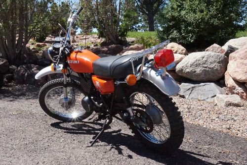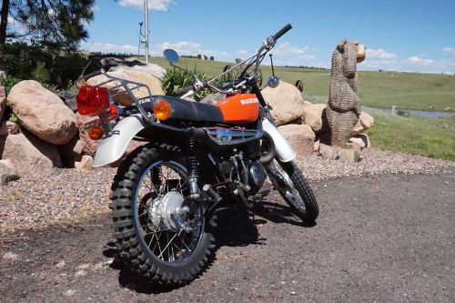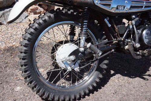 Here is a very nice 1976 Suzuki TC185 Enduro. This bike offers the hi-lo feature in the gear box, for hiway riding or trail riding, with 5 high range gears and 5 low range gears. It is also offers kick start and electric start, one of the first enduro bikes of its class to offer both. This bike starts easily, idles great, and runs strong. It has the CCI oil induction system so there is no pre mixing of the gas and oil. The inside of the gas tank is clean, all lights and electricals work as they should, including stop light, turn signals, high and low beam headlight, horn and electric start. The rear tire, battery, spark plug and air filter have all been replaced recently, the front tire has great tread, but is just starting to show a very minor amount of weather checking. It also has the handy luggage rack on the back.
