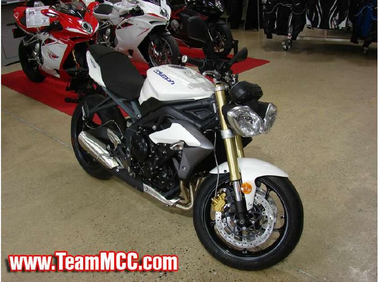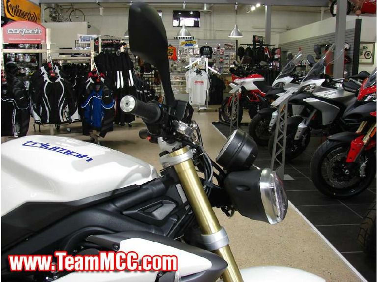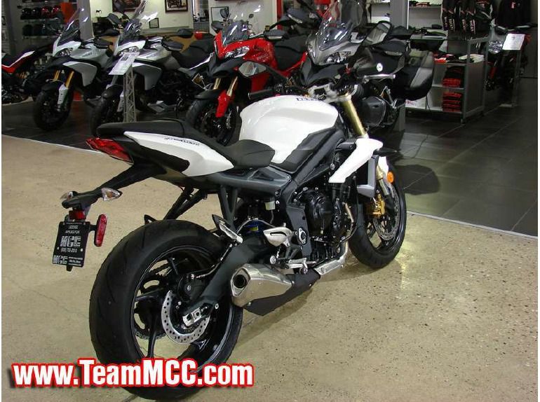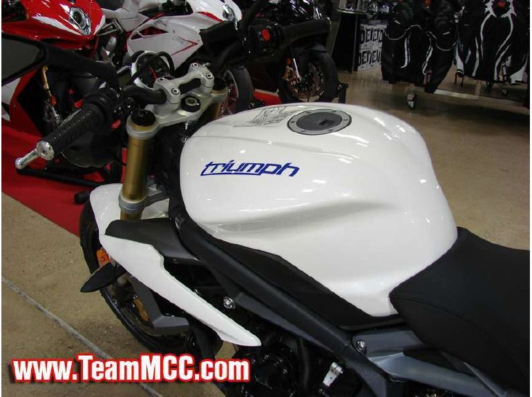 2013 Triumph Street Triple ABS - Crystal White, Completely new for 2013! - This truly impressive middleweight street motorcycle has been acclaimed by critics around the world. The all-new 2013 model is even punchier, better balanced and more exhilarating. The new chassis has a more dynamic specification, giving you agility and precision while keeping you planted, and better weight distribution and geometry give you an athletic, responsive ride. The heart of the Street Triple is the throbbing 675 cc triple, delivering 106 PS and 68 Nm of torque. It’s so good you’ll have trouble believing its only 675 cc. The torque and sound of the liquid-cooled 12-valve triple, combined with a close ratio 6-speed gearbox produce an exciting ride, and the under-engine silencer helps lower the center gravity and improve handling. It looks even better too, with stylish brushed metal finishes, aggressive headlights and a choice of colored-coded styling accessories complementing the dark powder coated engines and frames. MCC Motor Cycle Center serves Chicago, Illinois and all of the Chicagoland area. Call our sales team with any questions! We welcome all trades and offer full service, parts, accessories and apparel departments. Easy financing is available on most bikes! We carry Ducati, Triumph, MV Agusta, KTM, Husqvarna, and Norton motorcycles. We also rent Triumph motorcycles. See you soon!