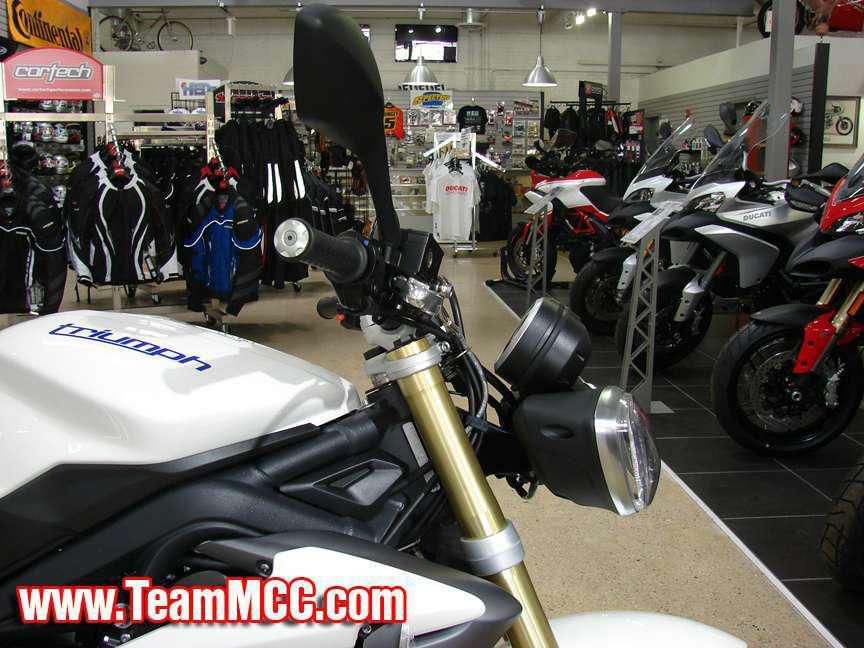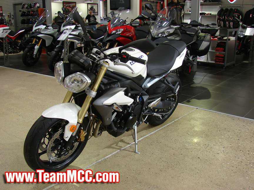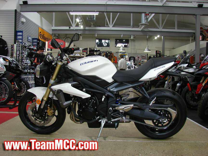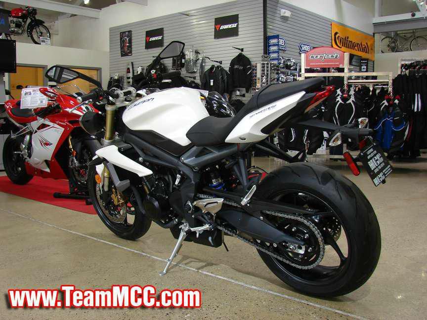 2013 Triumph Street Triple ABS - Crystal White, Completely new for 2013! - This truly impressive middleweight street motorcycle has been acclaimed by critics around the world. The all-new 2013 model is even punchier, better balanced and more exhilarating. The new chassis has a more dynamic specification, giving you agility and precision while keeping you planted, and better weight distribution and geometry give you an athletic, responsive ride. The heart of the Street Triple is the throbbing 675 cc triple, delivering 106 PS and 68 Nm of torque. It’s so good you’ll have trouble believing its only 675 cc. The torque and sound of the liquid-cooled 12-valve triple, combined with a close ratio 6-speed gearbox produce an exciting ride, and the under-engine silencer helps lower the center gravity and improve handling. It looks even better too, with stylish brushed metal finishes, aggressive headlights and a choice of colored-coded styling accessories complementing the dark powder coated engines and frames. MCC Motor Cycle Center serves Chicago, Illinois and all of the Chicagoland area. Call our sales team with any questions! We welcome all trades and offer full service, parts, accessories and apparel departments. Easy financing is available on most bikes! We carry Ducati, Triumph, MV Agusta, KTM, Husqvarna, and Norton motorcycles. We also rent Triumph motorcycles. See you soon!