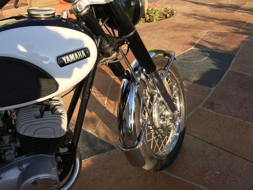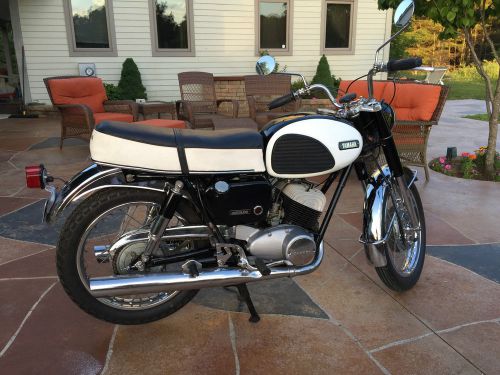 Up for your consideration is a 1966 Yamaha YM1 with matching serial numbers. This bike had a complete frame-off restoration 6 years ago. I acquired this bike about 7 years ago. It had a ugly rattle can paint job and was missing the speedometer. It appeared to be a low mileage bike because there was no noticeable ware in the original chain and sprockets. After removing the engine and pulling the jugs the low millage was confirmed. The cylinders still had the honing crosshatch marks viable and measured exactly to factory specifications. I had the heads bead blasted, re-honed the cylinders and installed new pistons and rings. All painted surfaces were stripped and primed with etching primer. The frame was painted with Nason 99 single stage black paint. The rest of the bike including the front forks, headlight bucket, side panel,oil tank and gas tank received Nason 2 stage base-coat / clear-coat. The surfaces were then sanded with 1200 and hand rubbed to a glass-like finish. I spend over $1000 in re-chroming every chromed component with the exception of the exhaust system. The pipes on the left side are very good with only a few small blemishes. The pipes on the right side I would rate as fair because of pitting on the top rear half of the muffler. It is not noticeable from 10 feet away. There are two other minor flaws, one is a small dent in the speedo bezel which I purchased used online to replace the missing one and a very small dent in the chrome part of the left front fork and one in the left muffler. None of these flaws are noticeable unless you look for them. All of the cables and most rubber components were replaced including new tires and tubes. I have the toolkit, 2 ignition keys and the fork lock key. Since restoration I have put less than 3000 miles in this bike. It is kept in a heated garage and only used on those special summer days. It will start on the first or second kick when cold and run flawlessly all day. If you are up for an adventure I will trailer this bike to BDL or MHT airport and you can ride it home where ever your home might be. I have only run 100LL aviation fuel in it because it never turns to varnish like automotive fuel. I am selling because I have 4 bikes now and its time to simplify. You will NOT be disappointed with this bike.