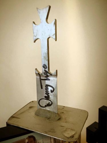 This custom made prop was used during the showdown halfway through the movie when Navajas has tracked down El Mariachi and goes down fighting, flinging his knives at all of his assailants. The piece is made from aluminium and features only the base of the blade and the cross handle, and is attached to an aluminium plate so it could sit perpendicular to the victim’s body and look as though it had penetrated deep into their flesh. Comes with the display and a ScreenUsed COA. |