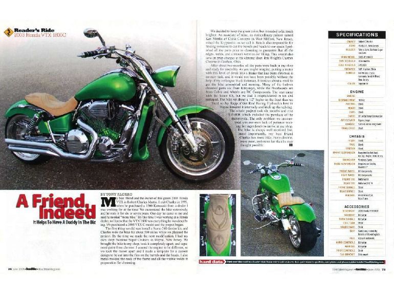 2003 Honda VTX1800C, Honda VTX1800C Custom Cruiser Wide Tire Kit in Kryptonite Green - Custom one off VTX1800 cruiser... Please see the pictures as words cannot describe the work that was done to this bike... Also see the magazine article attached... Describes much of what went into turning this VTX into the custom cruiser that it is... Priced to sell at $25,000 OBO - Cash Only - 856-809-9990, ask for Dan... (This vehicle is on consignment for the owner)